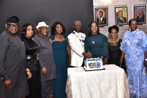 , L-R, Udeme Ufot, Husband of the Vice Chairman Chairman of International Chamber of Commerce (ICC) Nigeria, Prof. (Mrs.) Dorothy Udeme Ufot SAN;Chairman of Dangote Cement Plc, Special Guest of Honour and keynote Speaker, Mr. Emmanuel Ikazoboh;Wife of Chairman ICC Nigeria, Mrs.Obiageli Ihyembe; Chairman of International Chamber of Commerce (ICC) Nigeria,Chief Raymond Ihyembe; Vice Chairman Africa ICC Commission, Victoria Uwadoka; ICC Nigeria Treasurer, Dr. ( Mrs.) Omolara Ololade Akanji; ICC Nigeria General Secretary, Mrs. Bunmi Osuntuyi; at the 2025 ICC Nigeria Annual Dinner and Dance in Lagos on Friday 28th November 2025.