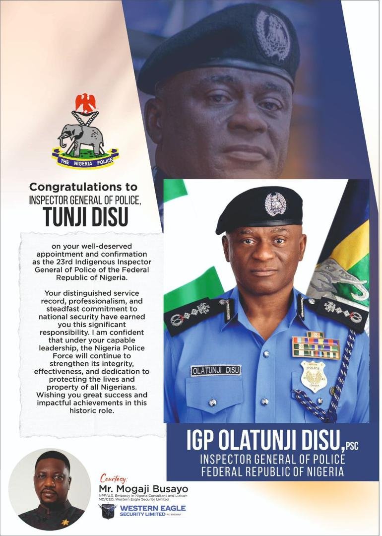 The Nigeria Police Force Liaison and Consultant to the United States Embassy in Nigeria, Mr. Mogaji Busayo, has congratulated the Inspector General of Police, IGP Olatunji Disu, following his appointment by President Bola Ahmed Tinubu, GCFR.
