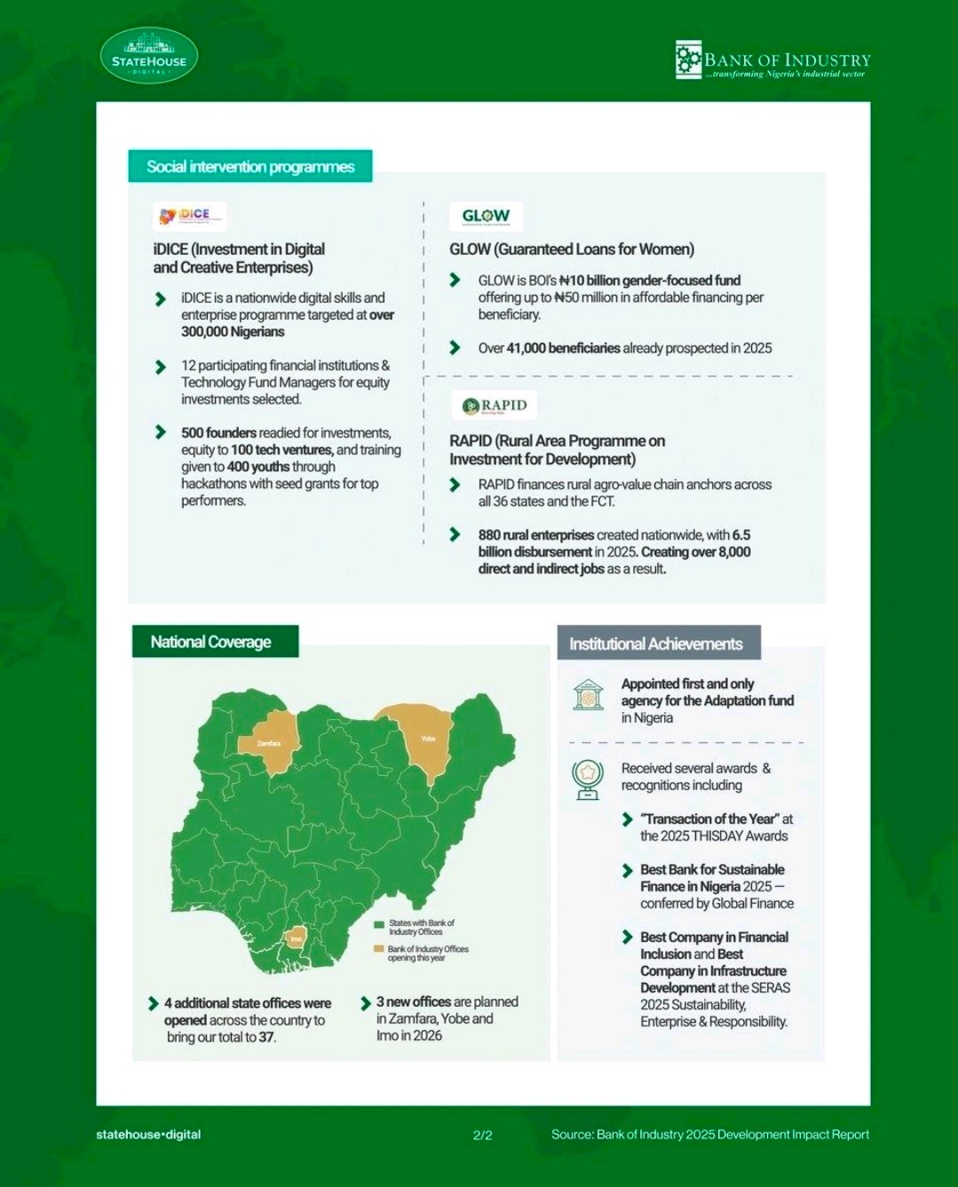 He added that the intervention led to the creation and retention of 1.6 million jobs, while 957,400 beneficiaries were supported under the Presidential Conditional Grant Scheme. Youth-owned enterprises were financed, women-backed businesses received structured capital, and rural enterprises were funded across all 36 states of the federation and the Federal Capital Territory (FCT).