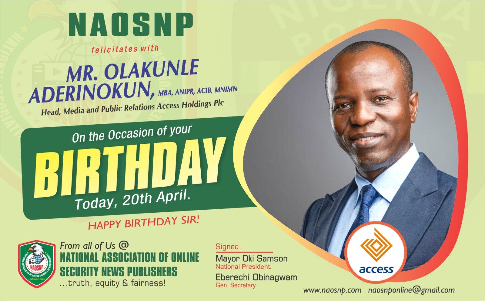 From all of us at the National Association of Online Security News Publishers, NAOSNP, we say, happy beautiful Birthday Sir, Mr. Olakunle Aderinokun.