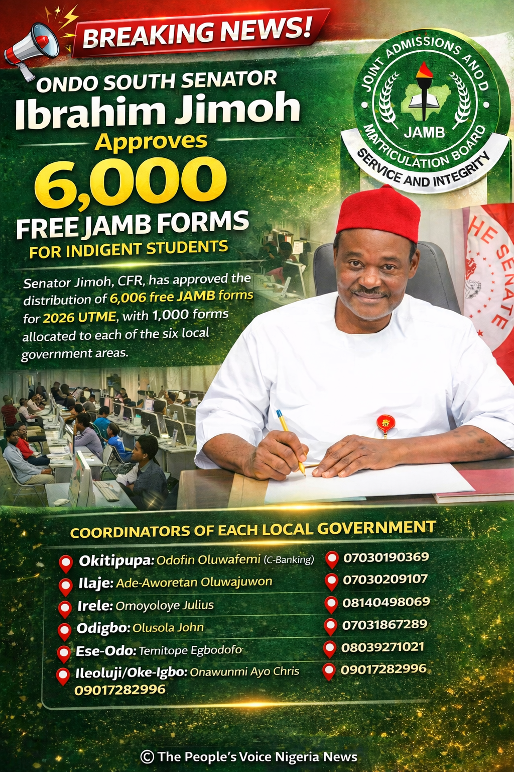 The Senator representing Ondo South Senatorial District, Ibrahim Jimoh, has approved the distribution of 6,000 free Joint Admissions and Matriculation Board (JAMB) forms to students across the district.